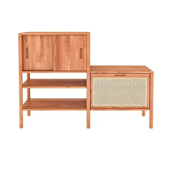 Das Holzregal Solara 2 überzeugt mit klarer Linienführung und einem modernen Akzent. Es bietet großzügigen Stauraum, zwei Schiebetüren mit feiner Fräsung als dezente Griffmulden sowie ein luftiges Rattan-Element, das dem Design eine natürliche Leichtigkeit verleiht.