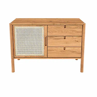 Die Kommode Solara 1 überzeugt mit klarer Formensprache und zeitgemäßer Ausstrahlung. Drei Schubladen und zusätzliche Ablageflächen hinter der Tür bieten großzügigen Stauraum. Das feine Rattan-Element in der Tür rundet das Design ab und verleiht der Kommode eine natürliche, luftige Leichtigkeit.