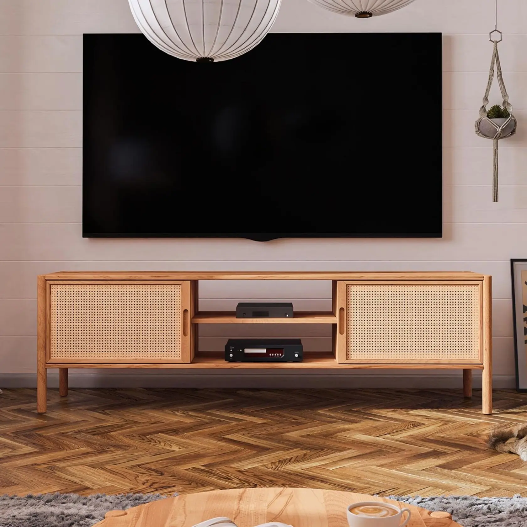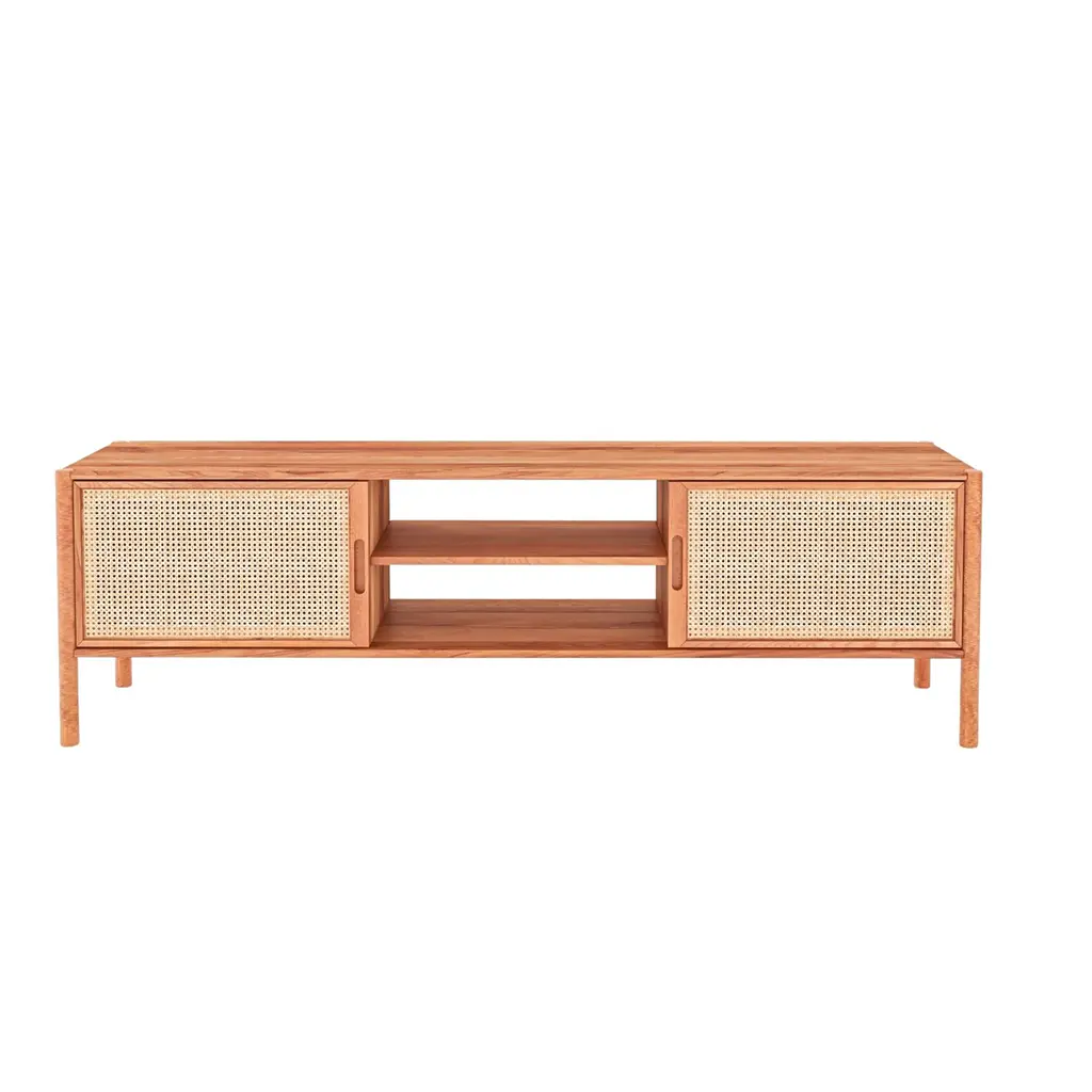 Das Sideboard Solara vereint Natürlichkeit mit filigranen Details: Zwei Türen mit  Rattan-Elementen bringen Leichtigkeit und Wärme in den Raum, während die beiden offenen Ablagefächer in der Mitte Platz für dekorative Lieblingsstücke bieten.